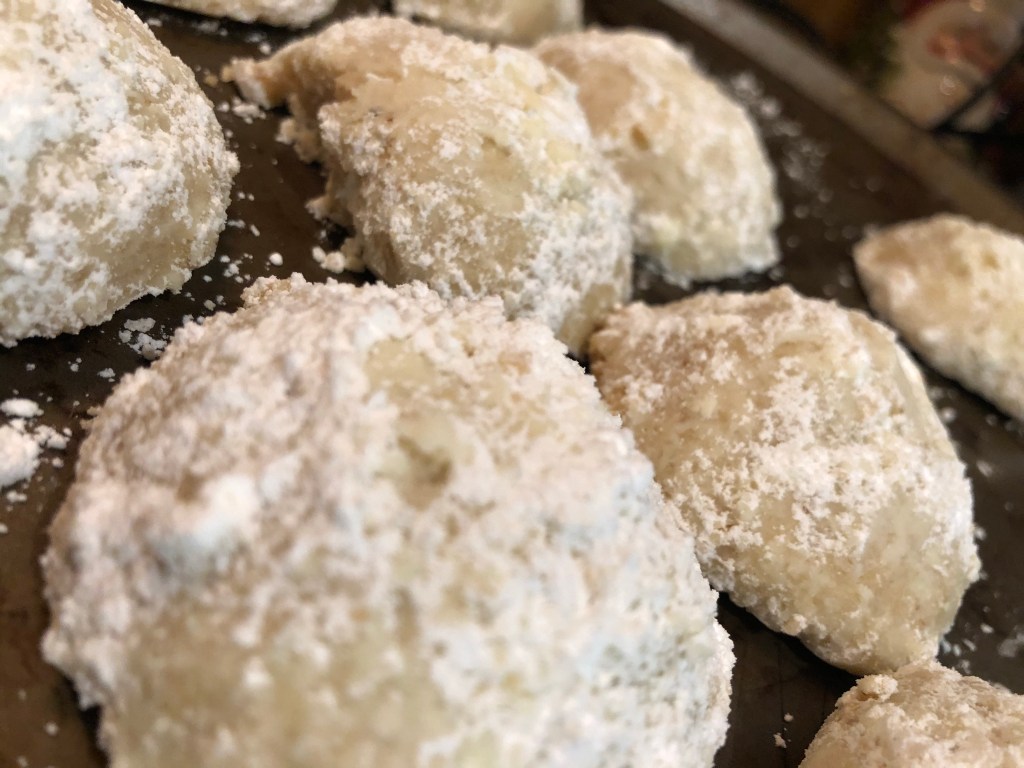 Italian wedding cookies 👩🏻🍳 they are made with crushed almonds, and coated with powder sugar, and look like small snow balls. They are beautiful to look at, and are lightly sweet, and believe me when I say 🤣 you can’t stop at just one.